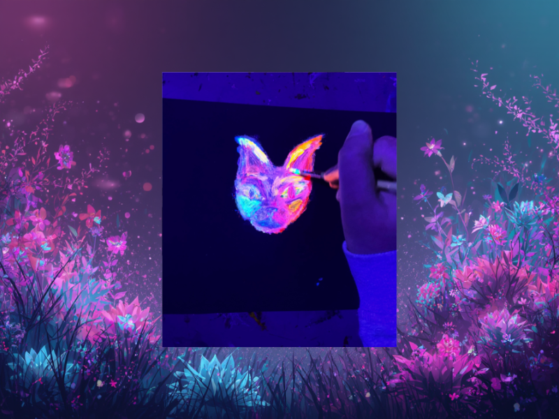 Sammen maler vi blade, former sommerfugle, blomster og små krible-krable-dyr i pap, som vi dekorerer med selvlysende maling. Alt det, vi skaber, bliver samlet til en fælles udstilling i en mørklagt kube i Børnebiblioteket. Når lyset slukkes, vågner haven til live – fuld af farver, former og hemmelige detaljer, der kun kan ses i mørket. Her kan børnefamilier, børnehaver, skoleklasser og andre nysgerrige besøgende gå på opdagelse i et sanseligt, lysende univers, hvor kreativitet og fantasi får lov at stråle.