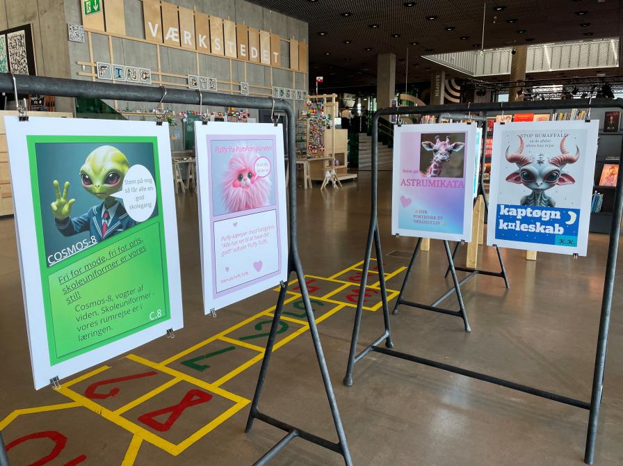 5. d fra Skødstrup skole har skabt 11 meget forskellige aliens. Eleverne har arbejdet med demokrati-øvelser, mærkesager og Ai, og har i programmet Collagemaker skabt de flotte valgplakater i udstillingen. Kom forbi udstillingen og find din favorit til verdens hersker.