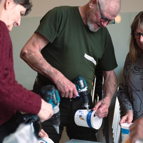 Deltagerne havde egne bøtter med. De blev hullet, afsprittet og beklædt med englehud før halm, mycelium (på korn) og vand blev tilført. Dette miks skal derpå passes og plejes og siden høstes 😊 30 små hjem er nu i gang med at gro egen mad.