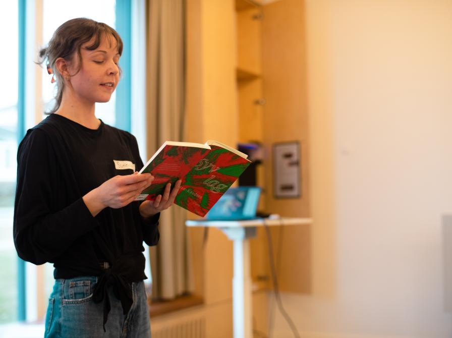 Efterfølgende skiftede vi scene og vendte blikket mere indad. Sunniva satte scenen ved at læse et digt op af Siri Ranva Hjelm Jacobsens ”Dafnesyndromet” samt et digt fra Julie Sten-Knudsens ”Syv lag”. På den måde blev deltagerne inspireret til selv at skrive sætninger på et stort lærred.