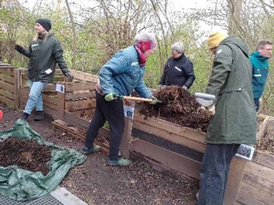 Her mødte 16 personer op til workshop med Marlene Kjeldsen. Greb, skovle, vandkander og fermenterede brændenælder var fundet frem og alle fik lov at mærke, snuse og pakke en kompost fra bunden.