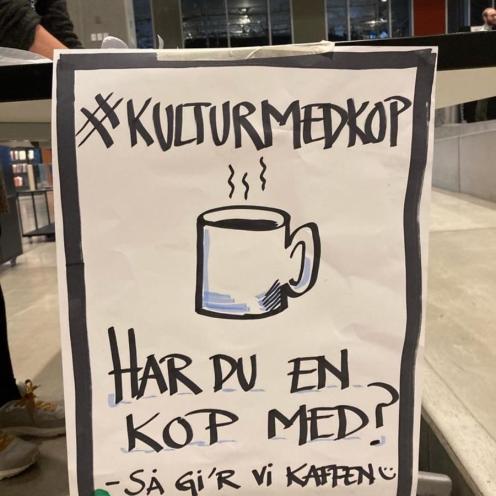 Kultur med kop betyder i sin enkelthed, at man tager sin egen kop med til arrangementer - så kaffen serveres heri - en aftale vi har indgået med vores café.