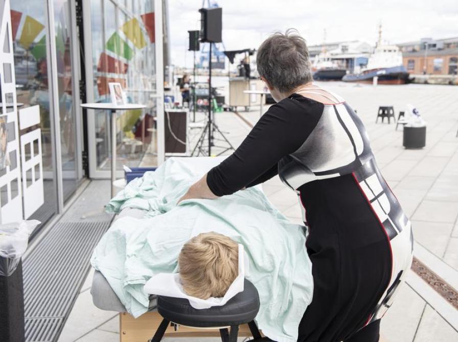 Zigne K Holm, sygeplejerske og sexolog, gav berøringsmassage, som er afsættet for billeder og tekst i Udstillingen ”Berøring” på Dokk1.